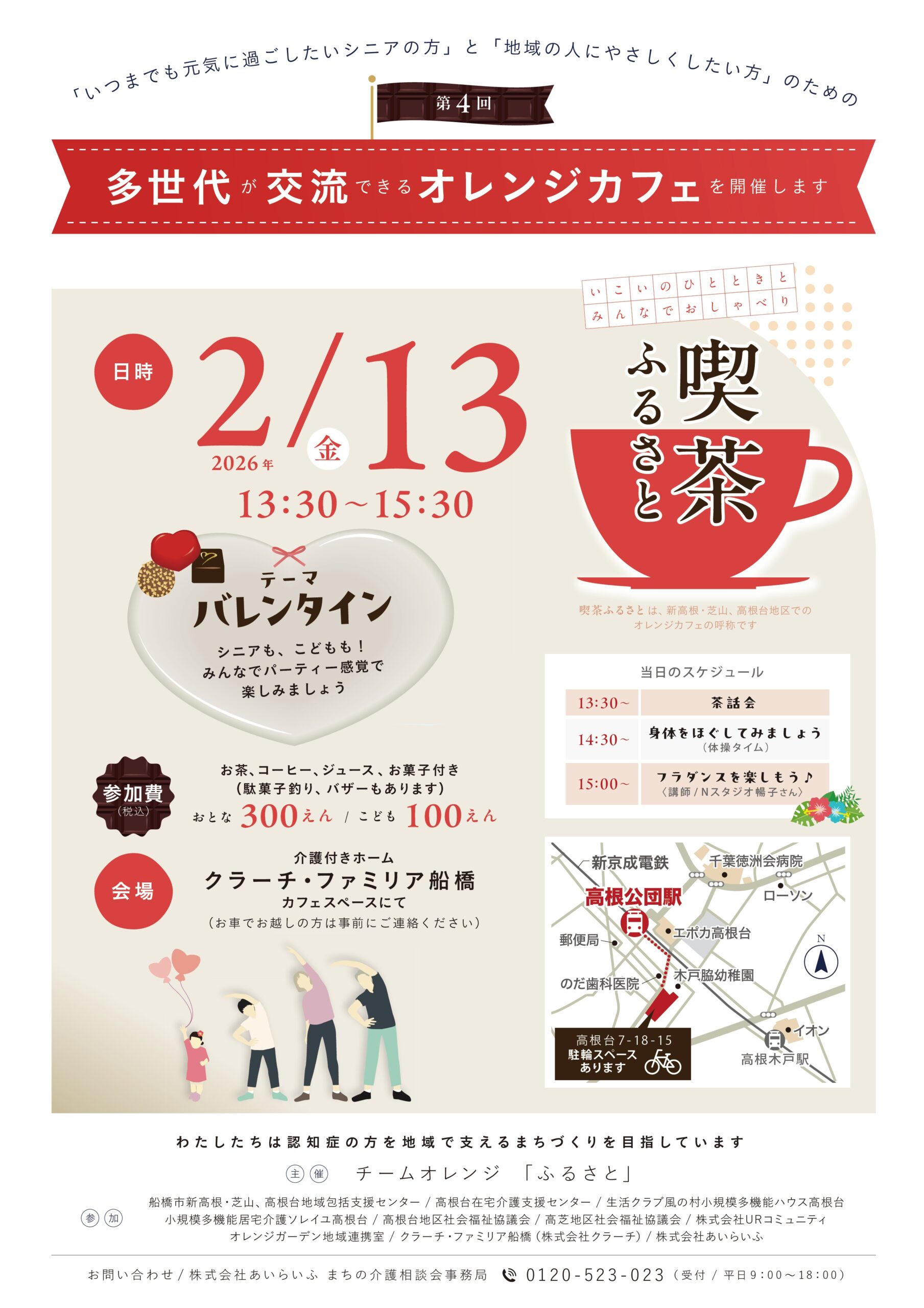 参加企業・団体:船橋市新高根・芝山、高根台地域包括支援センター、高根台在宅介護支援センター、生活クラブ風の村小規模多機能ハウス高根台、小規模多機能居宅介護ソレイユ高根台、高根台地区社会福祉協議会、高芝地区社会福祉協議会、株式会社URコミュニティ、オレンジガーデン地域連携室、クラーチ・ファミリア船橋(株式会社クラーチ)、株式会社あいらいふ